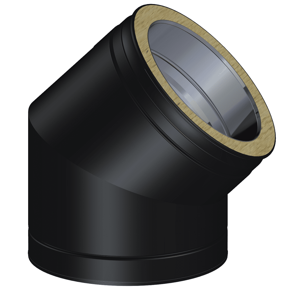This 5″ (130mm) Black 45 Degree elbow is part of the Dinak DW Design System, which is a twin wall flue chimney system manufactured in Europe. Suitable for all types of applications: wood, pellets, gas, gas oil and condensing oil. This elbow is used to aid in the change of direction within a flue system.