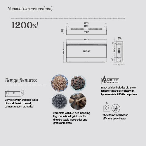With an efficient 1.6kW thermostatic heater, the eFlame 1200SL not only looks impressive but also provides comfortable, controllable heat for your living space. Designed for media wall installations, it is suitable for TVs up to 43 inches when installed above the fire.
