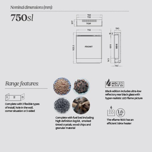 Perfect for creating a striking feature in smaller spaces or within a mantel, the eFlame 750SL combines cutting-edge flame technology with a sleek, slimline design. This compact electric media wall fire delivers all the performance and versatility of our larger models, making it ideal for apartments, snug living rooms, or stylish media wall installations.