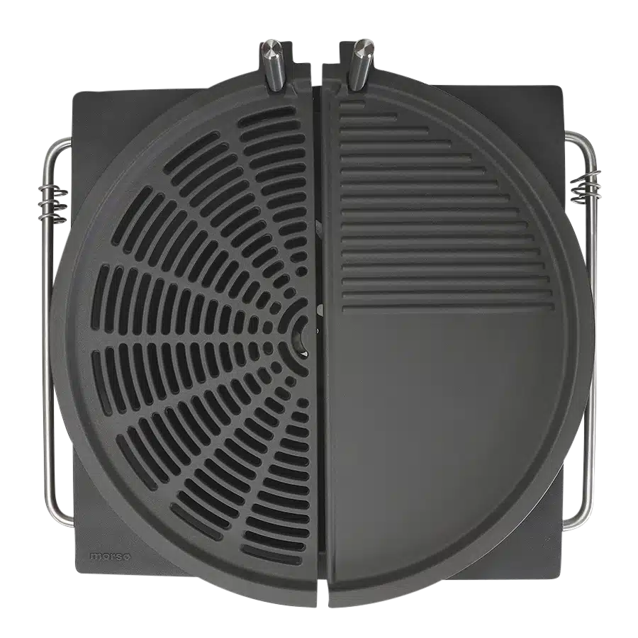 The Morsø Grill ’17 is a premium outdoor barbecue designed to combine striking Scandinavian style with exceptional cooking versatility. Crafted from durable enamelled cast iron with a sleek stainless steel table, it functions as both a practical grill and a stylish piece of garden furniture. At its core is a 60cm cooking area made up of a grill grate and twin semi-circular plates, each individually height-adjustable and able to swivel aside,