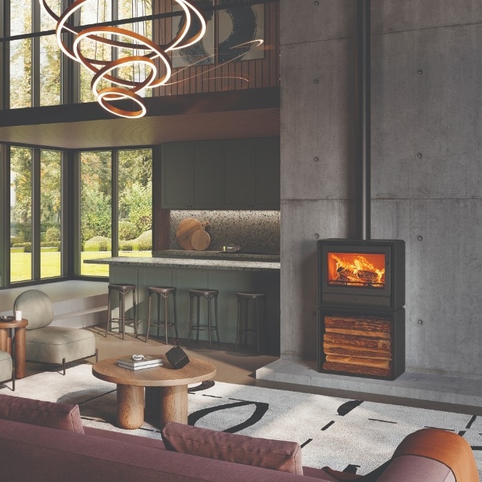 Style / Finish Options: Matt black finish standard; optional cast or wood-effect feet; optional log-store base; compatible with stove bench installation